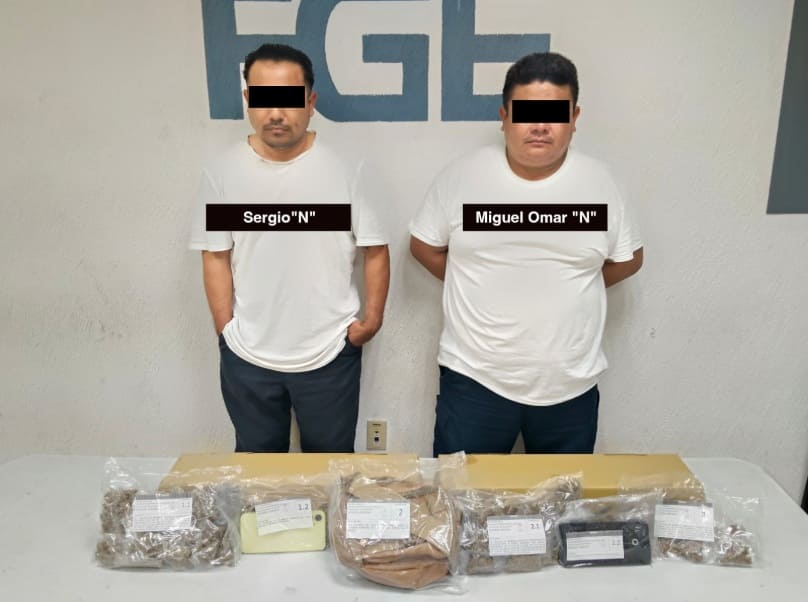 Guilibaldo “N” and Alejandro “N” were arrested in the Palmas I subdivision and on 25th Avenue North, respectively, when agents were carrying out investigation work and surprised both subjects handling a green plant similar to marijuana.