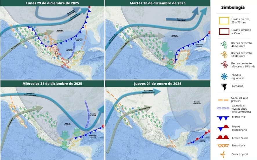 “Intense to torrential downpours are forecast for Puebla, Veracruz, Oaxaca, Chiapas, and Tabasco on Tuesday. The Arctic air mass associated with the front will maintain lower temperatures in northern, northeastern, eastern, central and southeastern Mexico, as well as strong northerly winds along the coasts of Tamaulipas and Veracruz, the Isthmus and Gulf of Tehuantepec, and very strong winds in the Yucatán Peninsula.