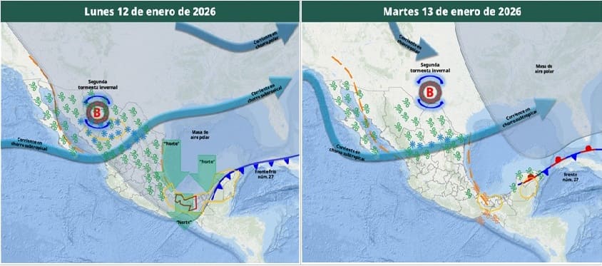 “The polar air mass associated with the front will maintain cold to very cold conditions during the morning and night over central, eastern and southeastern Mexico, as well as a strong to intense “Norte” wind event along the Gulf of Mexico coast, the Isthmus of Tehuantepec, and the Gulf of Tehuantepec, a condition that will diminish during the night.
