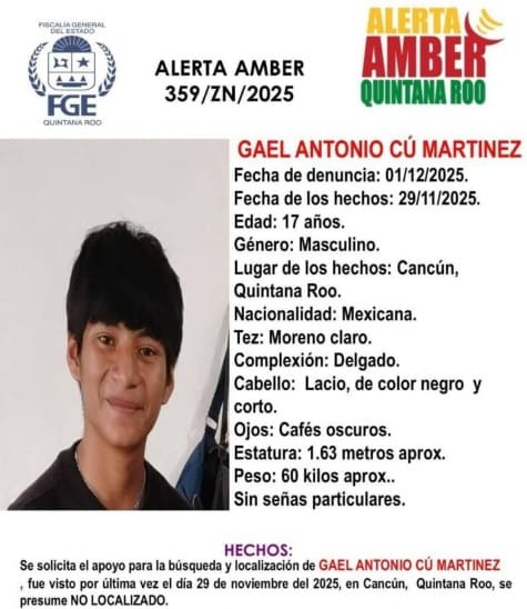 The young 17 year old worked at a Cancun pizzeria and was last seen Saturday night when he left work with a group of friends. His family filed the missing persons report after being unable to contact him.