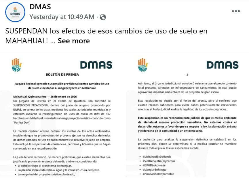 On January 21, Defending the Right to a Healthy Environment (DMAS) filed an injunction against what they said was the illegal reconfiguration of land use on more than 107 hectares in Mahahual for the Perfect Day tourism project.