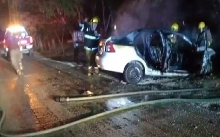Puerto Morelos, Q.R. — Local firemen were called to the scene of a single vehicle accident along Ruta de los Cenotes early Saturday. Responding emergency personnel arrived to a burning car that was left abandoned.
