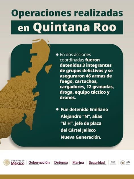 On social media, García Harfuch posted “in coordinated operations in Quintana Roo, authorities arrested individuals responsible for violence in the region and seized drugs, weapons, and tactical equipment. These operations are part of the fourth pillar of the National Security Strategy: coordination among the three levels of government.”