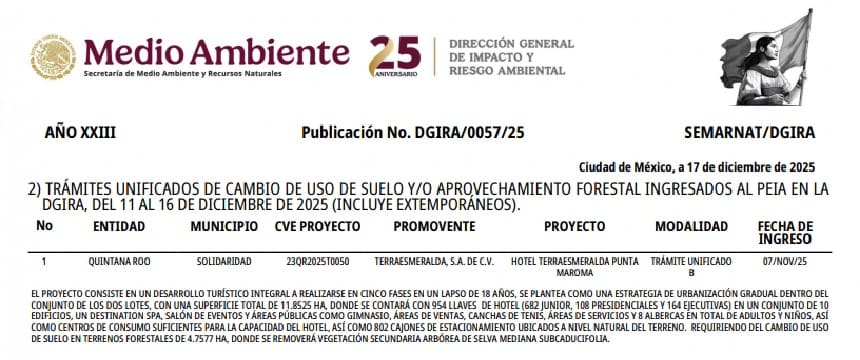 The Unified Technical Document was submitted to the Ministry of Environment and Natural Resources November 7, 2025 and forwarded to the corresponding sector manager December 4. It was published in the latest December edition of the Ecological Gazette for consideration.