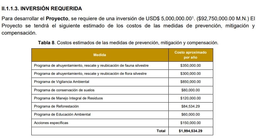 “To develop the Project, an investment of USD$5,000,000.00 (MXN $92,750,000.00) is required,” they reported outlining the costs.