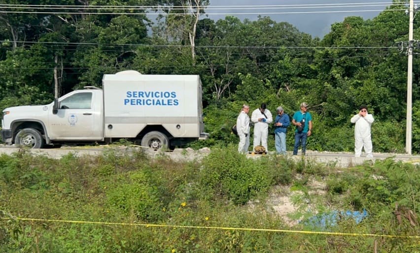 Bomberos (firemen) from Puerto Morelos were the first to arrive in response to motorist reports of the 9:30 a.m. accident. At the scene, authorities located a rolled Nissan that, according to early information, swerved off the highway and flipped due to a burst tire.