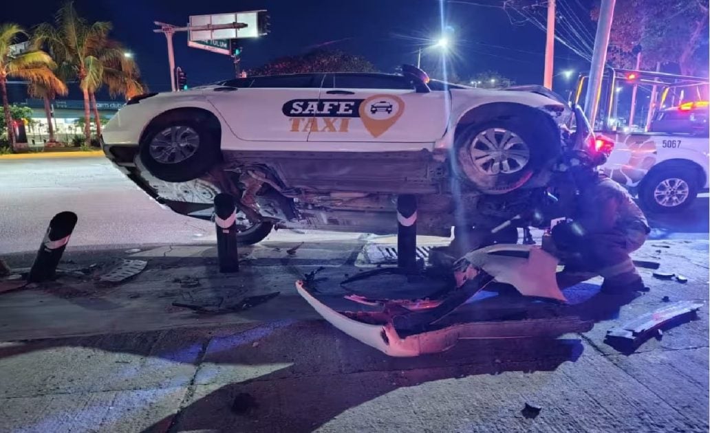 The car hit the posts, along with other city infrastructure at the intersection of Xcaret Avenue and Tankah Avenue. According to available information, the driver of the Safe Taxi was taking a corner at a high rate of speed when he lost control and ended up on top of the posts.