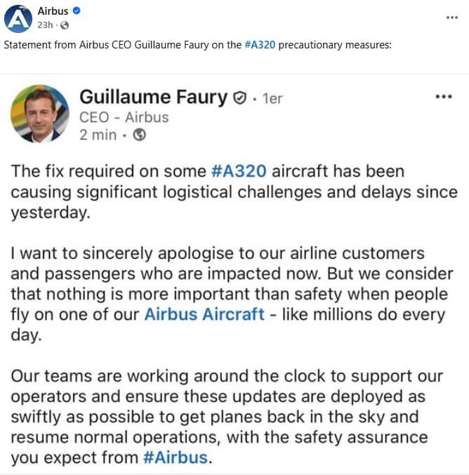 “Our teams are working around the clock to support our operators and ensure these updates are deployed as swiftly as possible to get planes back in the sky and resume normal operations, with the safety assurance you expect from Airbus.”