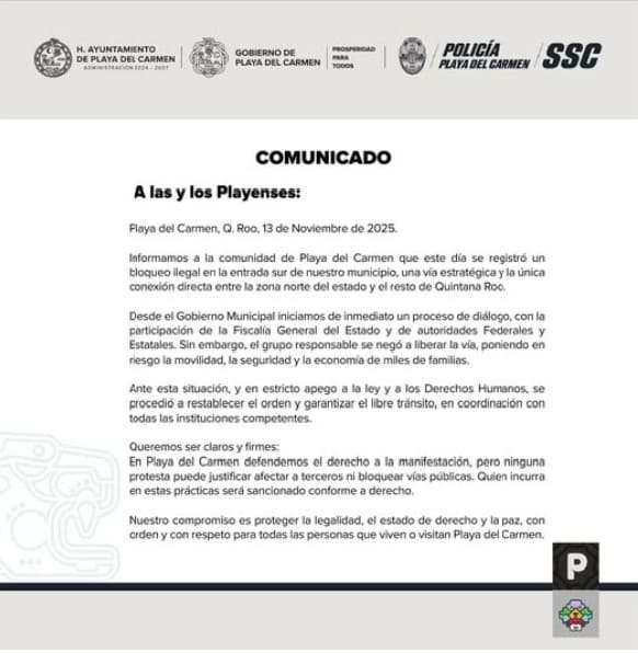 “The Government of Playa del Carmen reports that, faced with an illegal blockade at the southern entrance of the municipality, actions were activated to restore order and guarantee free transit, in accordance with the law and Human Rights.