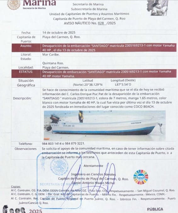 Playa del Carmen, Q.R. — The Harbor Master’s Office of Playa del Carmen has issued a nautical warning for a missing boat. A skiff-type vessel named Santiago has been reported missing as of October 13.
