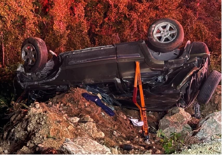 Riviera Maya, Q.R. — Firemen used the jaws of life to remove a woman from her rolled SUV early Thursday. The vehicle was found laying crushed on its roof after leaving the road and rolling onto a mound of rocks.