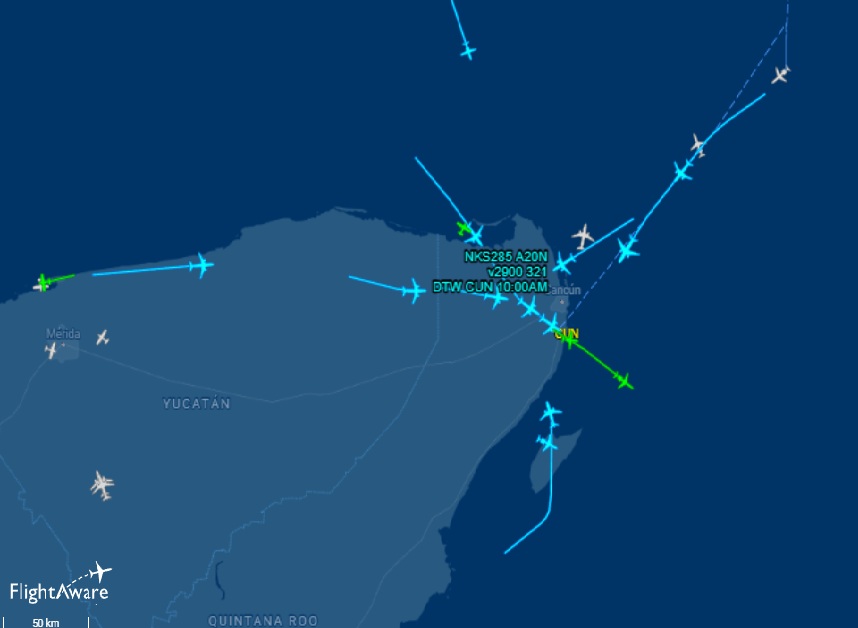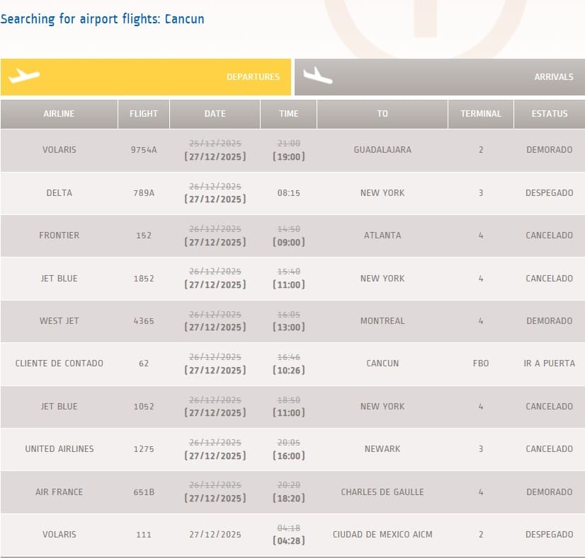 Delta registered two cancellations and 24 delays into Cancun, while United reported one cancellation and 27 delays into the Mexican Caribbean airport capital.