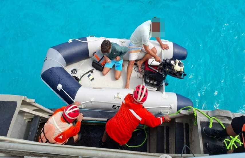 Isla Mujeres, Q.R. — Two people who found themselves drifting due to a failed motor were rescued in their dinghy. The Mexican Navy, acting as Coast Guard, were alerted to the need for assistance off the coast of Isla Mujeres Thursday afternoon.