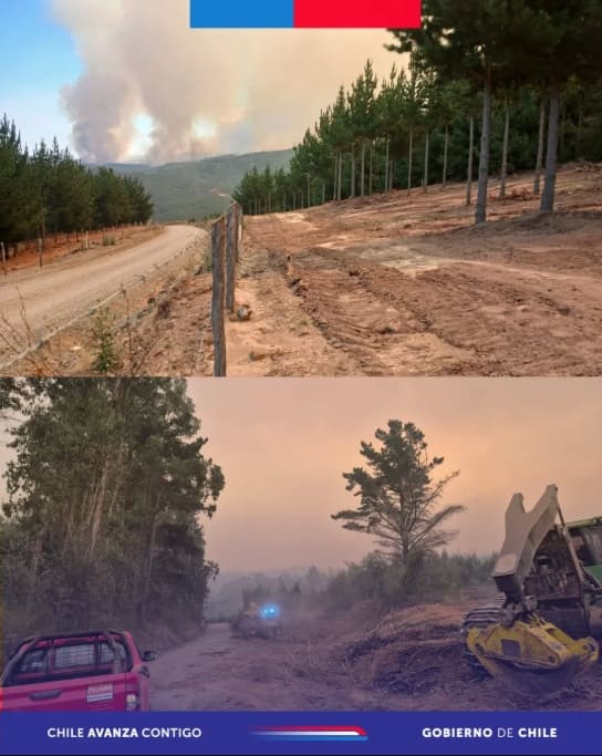 The work includes opening firebreaks, controlling hotspots, and monitoring perimeters in the Biobío and Araucanía regions to contain the spread of the 85 active fires in the South American country.