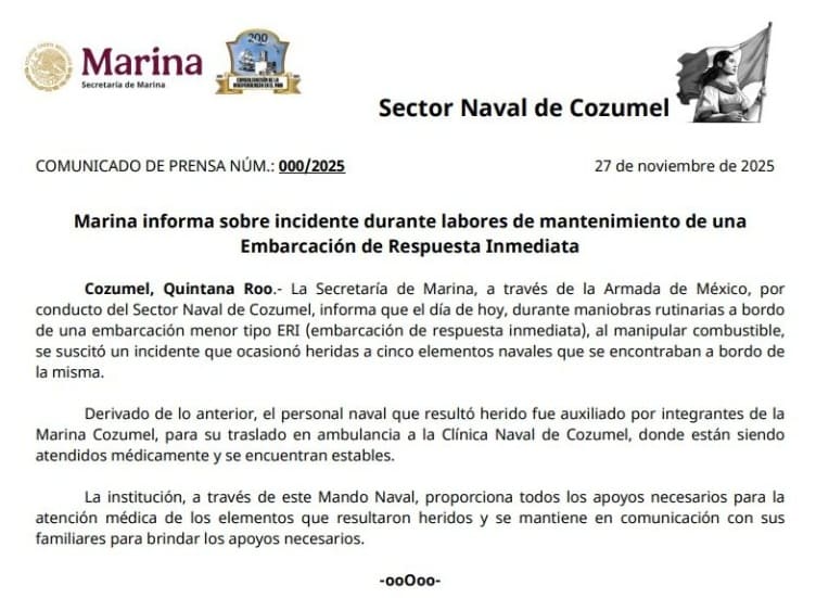 Five naval personnel were injured and received immediate assistance from Cozumel Navy personnel before being transported by ambulance to the island’s Naval Clinic. All are reported to be in stable condition, receiving specialized care.