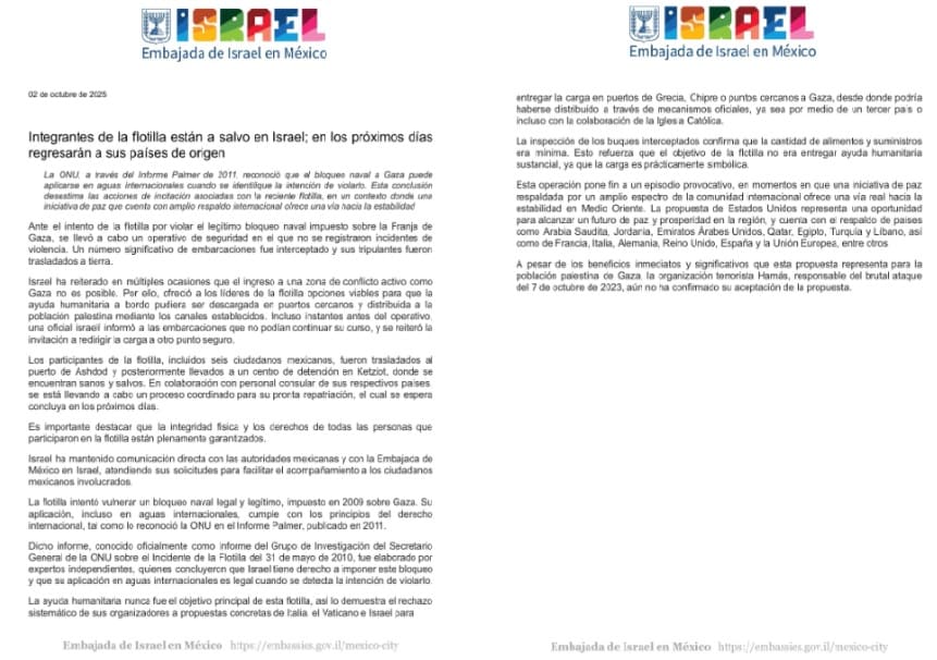 Mexico City, Mexico — President Claudia Sheinbaum Pardo demanded that the Israeli government immediately repatriate six Mexicans. The six are members of the Sumud Global Flotilla transporting humanitarian aid for the Palestinian people in Gaza.