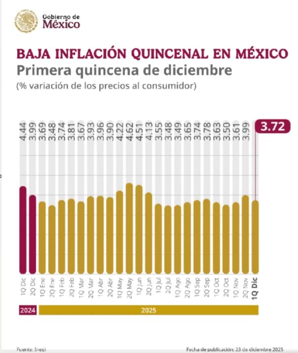 Mexico City, Mexico — Mexico’s president highlighted the decrease in inflation to 3.72 percent during the first half of December. On Tuesday, President Claudia Sheinbaum Pardo highlighted the decrease compared to the same period in November.