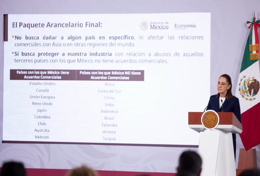 Sheinbaum clarified that the Tariff Package applies to nations with which there is no trade agreement. Furthermore, Mexico is in talks with other countries such as Asian territories such as China and South Korea, through the Ministry of Economy and its embassies.