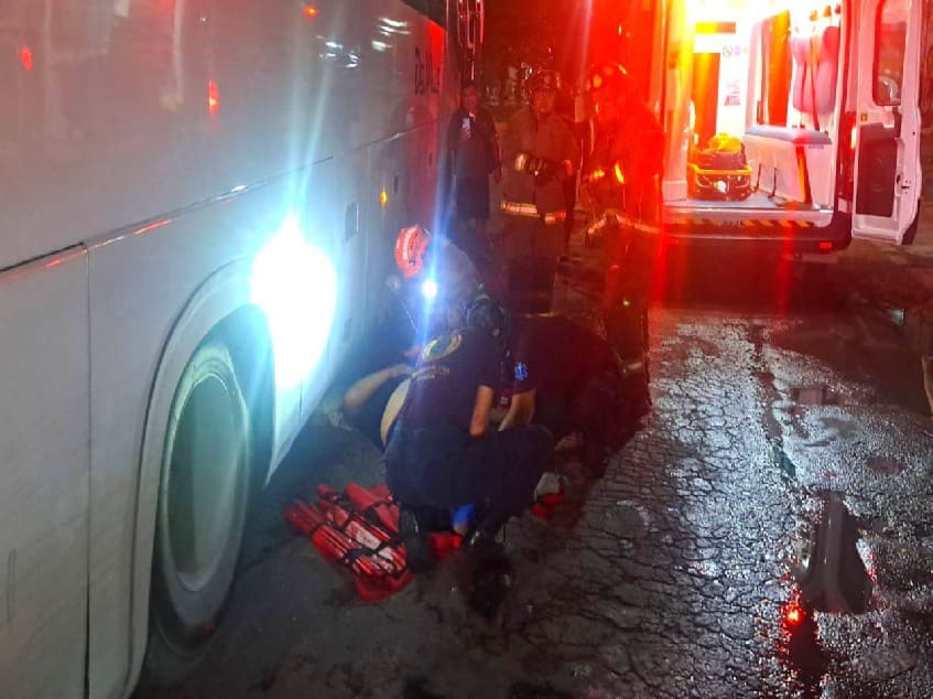 Cancun, Q.R. — A city man was found with non-life-threatening injuries after falling under a bus. Cancun firemen were first on scene Thursday evening in response to pedestrian reports of the accident.