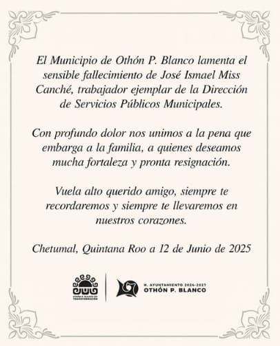 “With profound sadness, we join in the grief felt by family and friends over the passing of our colleague José Ismael Miss Canché, an exemplary employee of the Municipal Public Services Department. Rest in peace.”