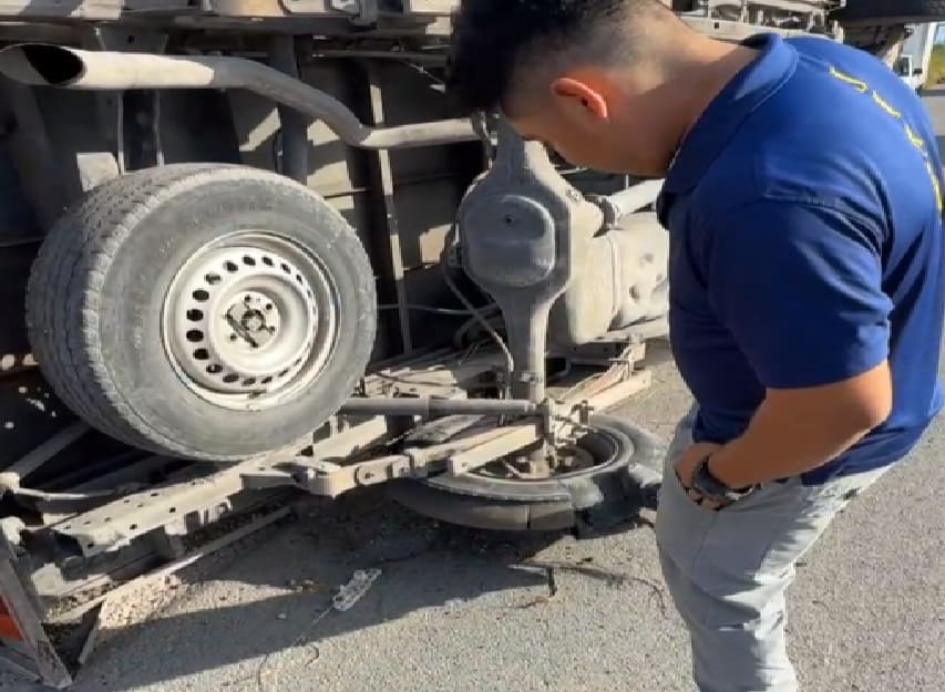 Puerto Morelos, Q.R. — A ruptured rear tire caused a small cargo truck bound for Playa del Carmen to overturn Saturday. The driver was heading south to Playa del Carmen from Cancun when the tire blew.