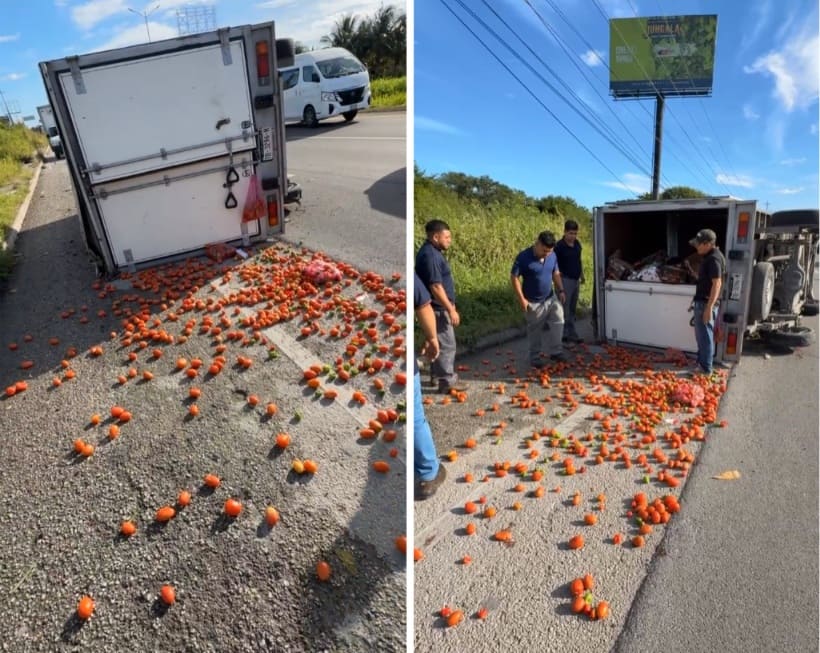The accident was reported late Saturday morning approximately three kilometers from the north Playa del Carmen municipal border. A second company cargo vehicle arrived to remove the remaining boxes of produce from the overturned truck.
