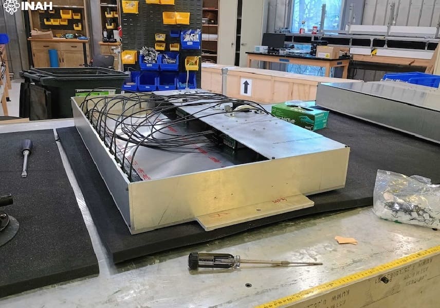 To this end, as García Solís explained, two identical muon detectors were built and will be installed in the north and south tunnels of the pyramid. Their electronic components consist of three foldable panels (60 cm by 1 m) mounted on a structure, giving each detector a dimensions of 1.40 meters by 68 cm and a height of 1.50 meters,