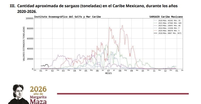“Given the decision to maintain the strategy at the beginning of 2026, approximately 178.01 tons of sargassum have been collected this year in the municipalities of Isla Mujeres, Benito Juárez (Cancun), Puerto Morelos, Cozumel, Playa del Carmen, Tulum and along the beaches of Mahahual and Xcalak, in the municipality of Othón P. Blanco,” they reported.