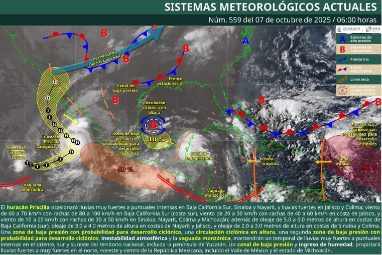 According to Mexico’s National Meteorological Service “a low pressure zone with a probability of cyclonic development located south of the coasts of Chiapas and Oaxaca, a high cyclonic circulation off the coast of Veracruz and a second low pressure zone with a probability of cyclonic development, will move over the Yucatan Peninsula.