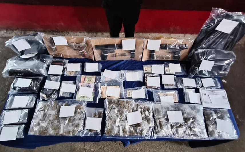 In a statement, police reported seizing “268 small transparent plastic bags containing a green plant material resembling marijuana, three 9mm handguns with magazines loaded with 15, 14, and 13 rounds of 9mm ammunition and three identification cards.”