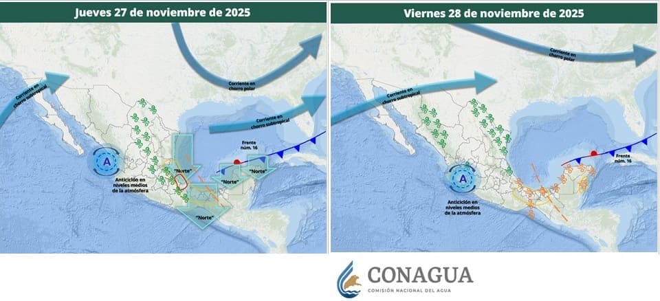 Meanwhile, the polar air mass associated with the front will modify its thermal characteristics throughout the day, favoring a gradual rise in temperatures. However, it will maintain northerly winds with gusts of 50 to 70 km/h along the coasts of southern Veracruz, Tabasco, Campeche, Yucatan and Quintana Roo, diminishing during the afternoon along with high waves.
